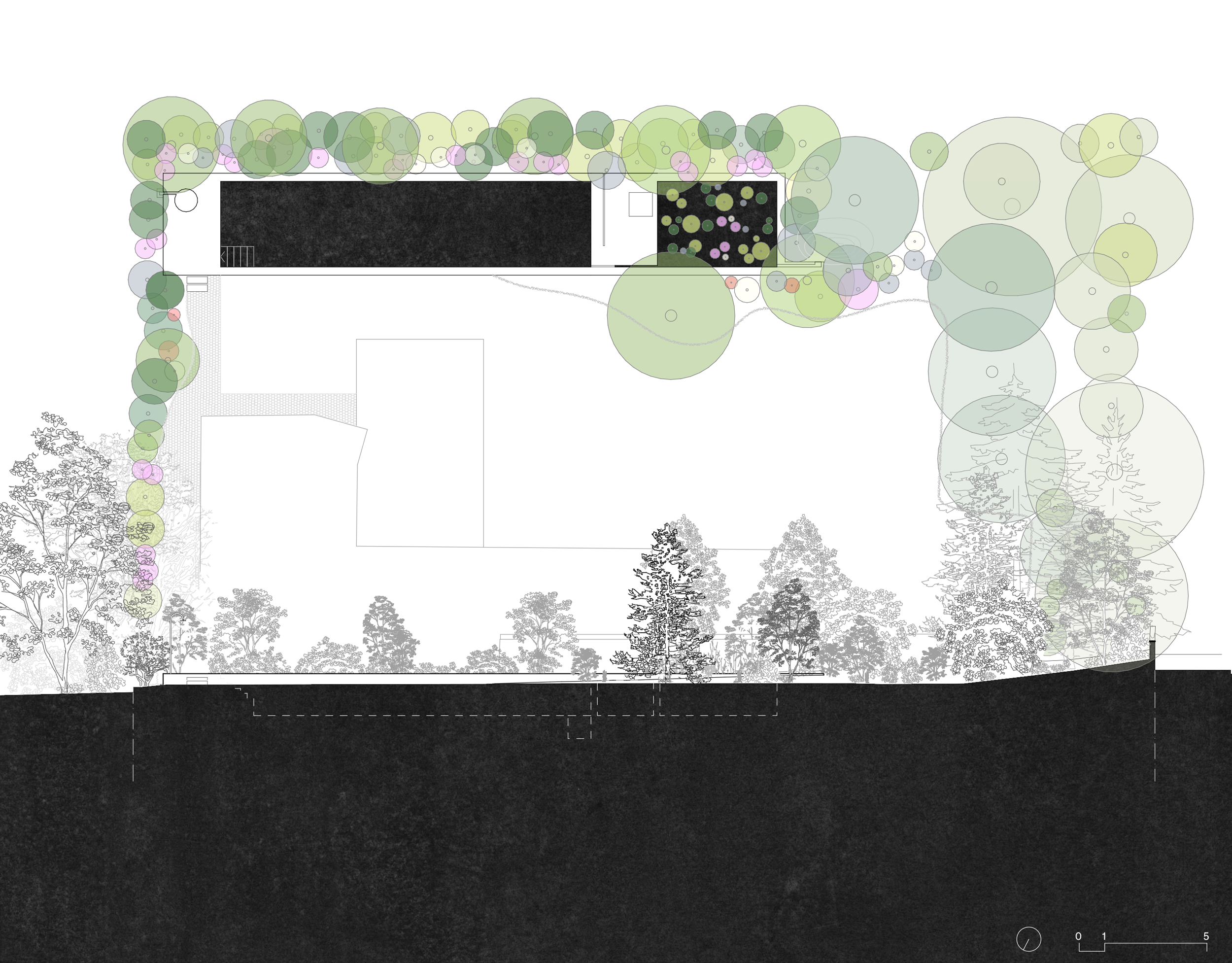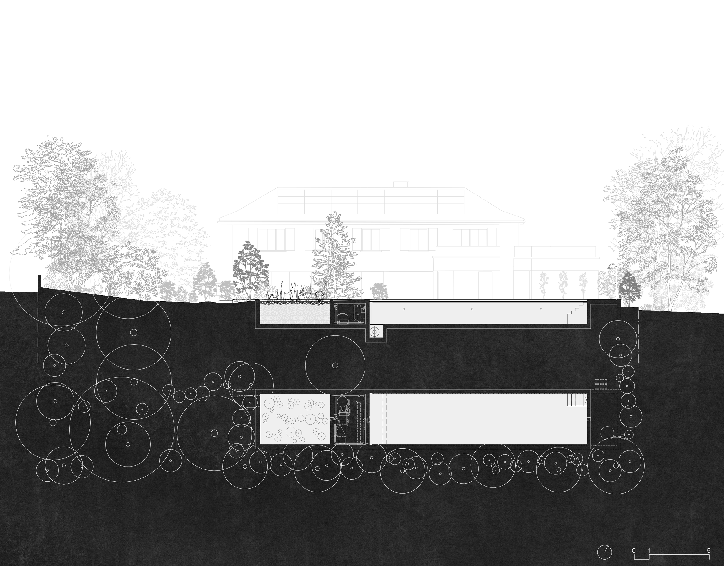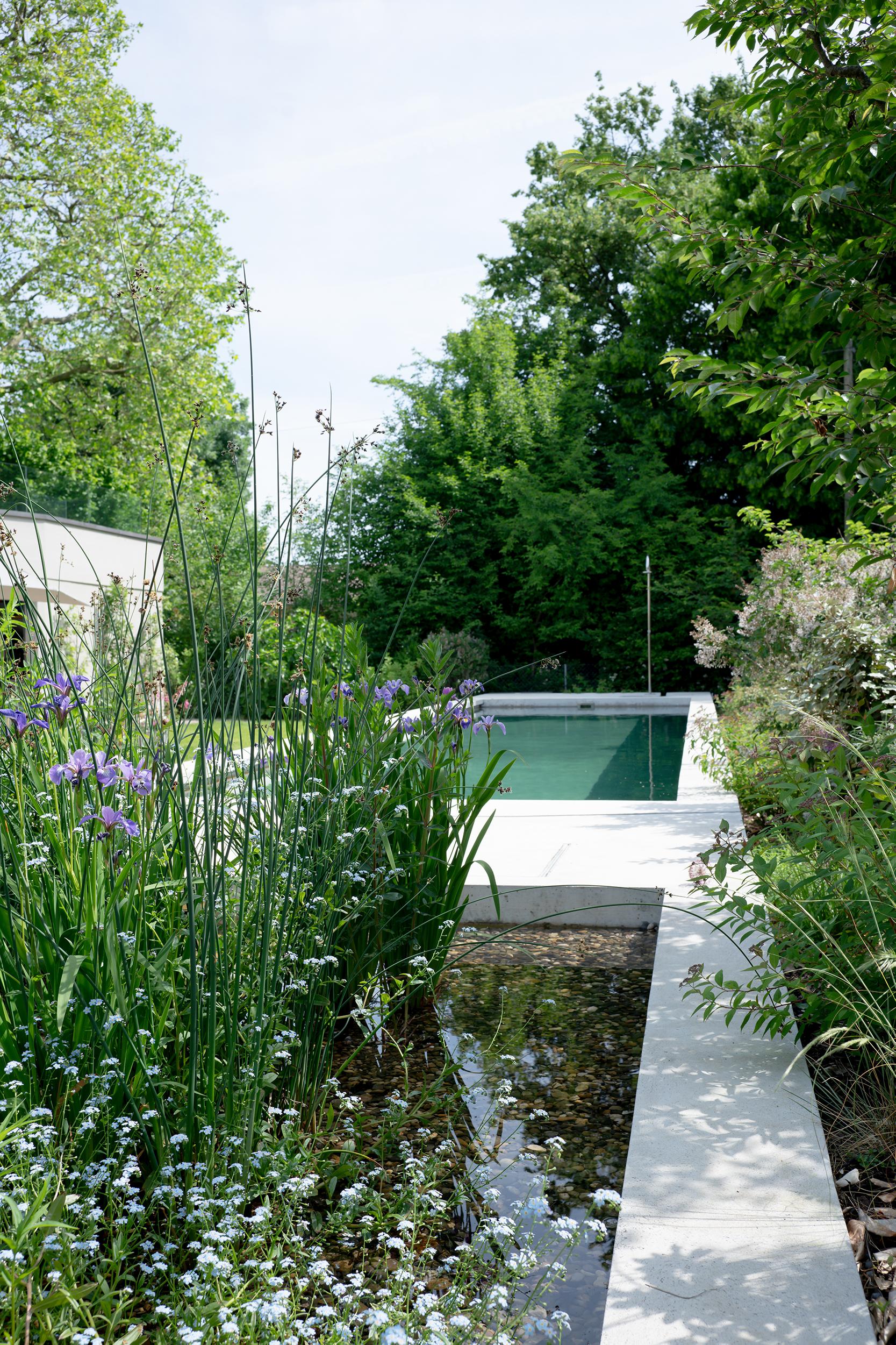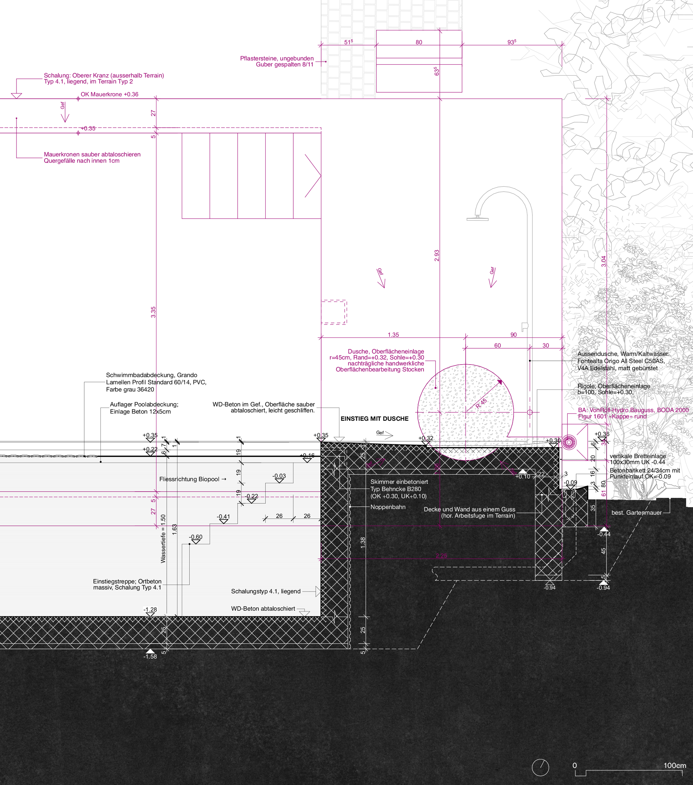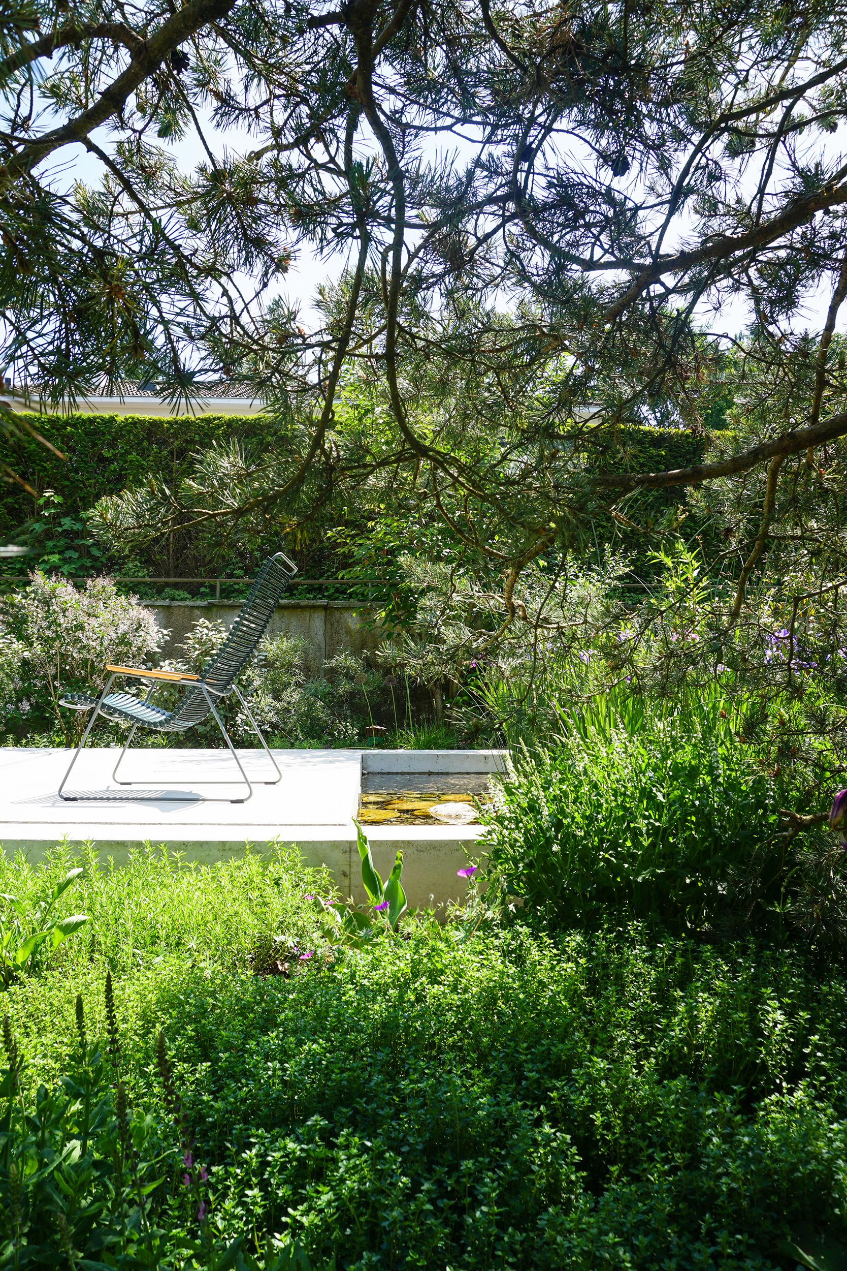 Die Aussenanlage des bestehenden Einfamilienhauses wird umgestaltet. Ein Biopool wird neben dem bestehenden Wald zum Herzstück des Gartens. Das Schwimmbecken liegt wie ein grosszügiger Brunnen in der Fläche. Dahinter ragt die quartiertypische Begrünung empor und am Kopf verzahnt sich die scharfkantige Geometrie mit dem dichten Geflecht aus Bäumen, Sträuchern und Bodendeckern. Das charakteristische Merkmal des Gartens als Teil der parzellenübergreifenden Durchgrünung wird beibehalten und gestärkt. Die Begrünung erfolgt mit standortgerechten Pflanzen und die Wasseraufbereitung findet biologisch statt.