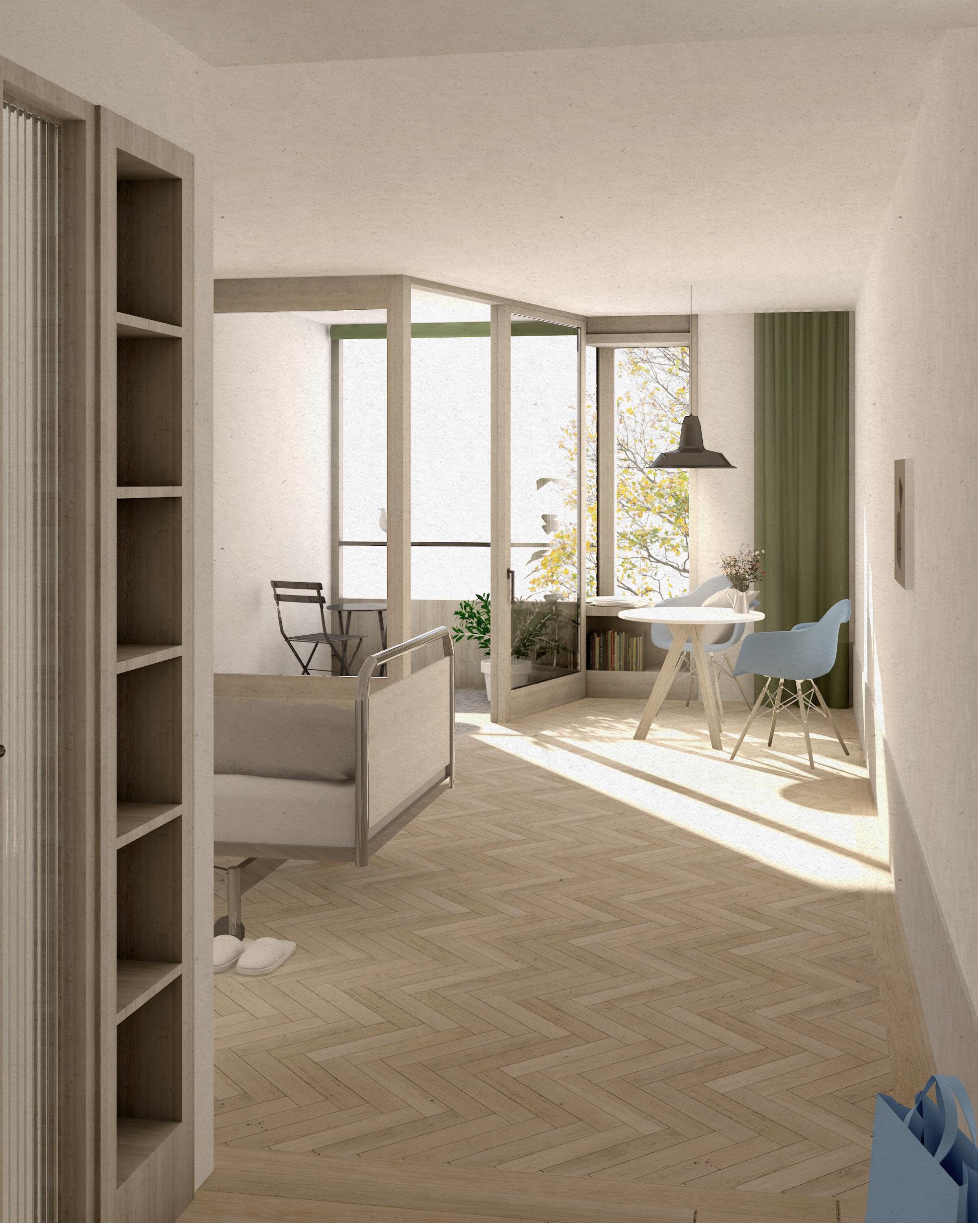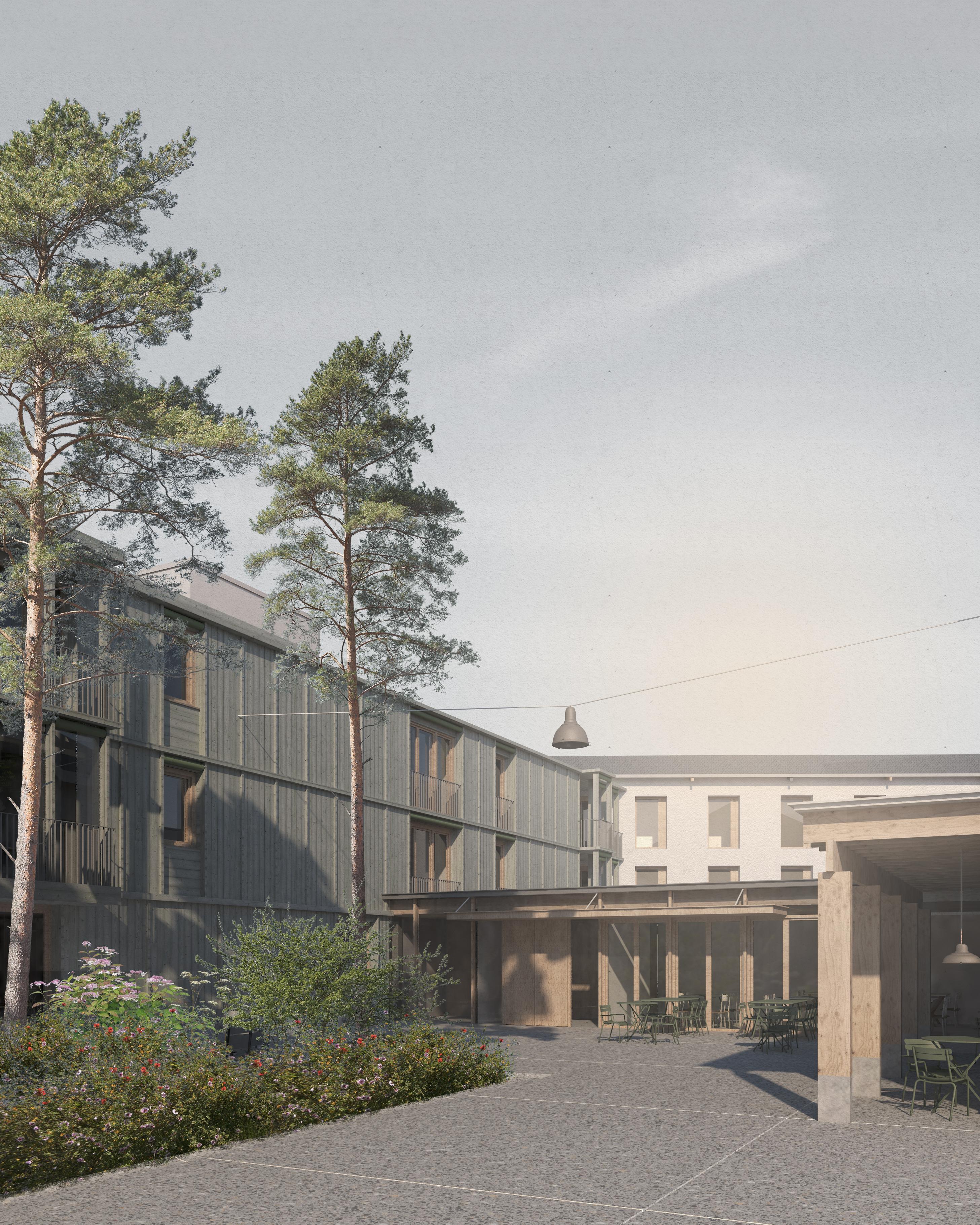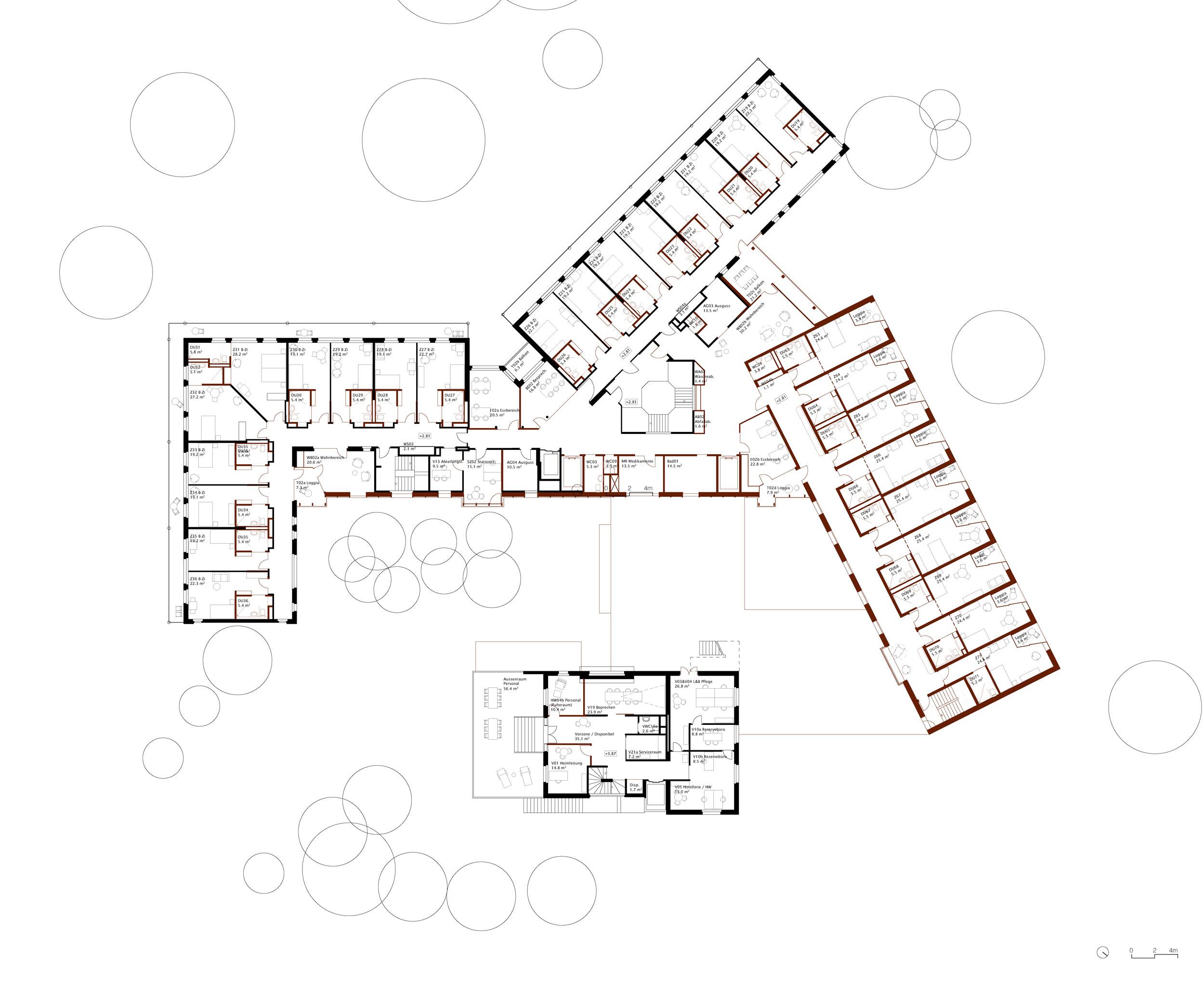 Die Logik der lateral zur zentralen Erschliessung angeordneten Bewohnerzimmer wird durch eine Erweiterung von Zimmern mit Ost-West-Orientierung unter einem Satteldach weitergeführt. Die bestehende Erschliessung rückt dadurch ins Zentrum der Anlage und erhält das notwendige Volumen um die Räume der Abteilungen aufzunehmen und dem neuen Hof eine angenehm und poröse Längsfassade zu geben.