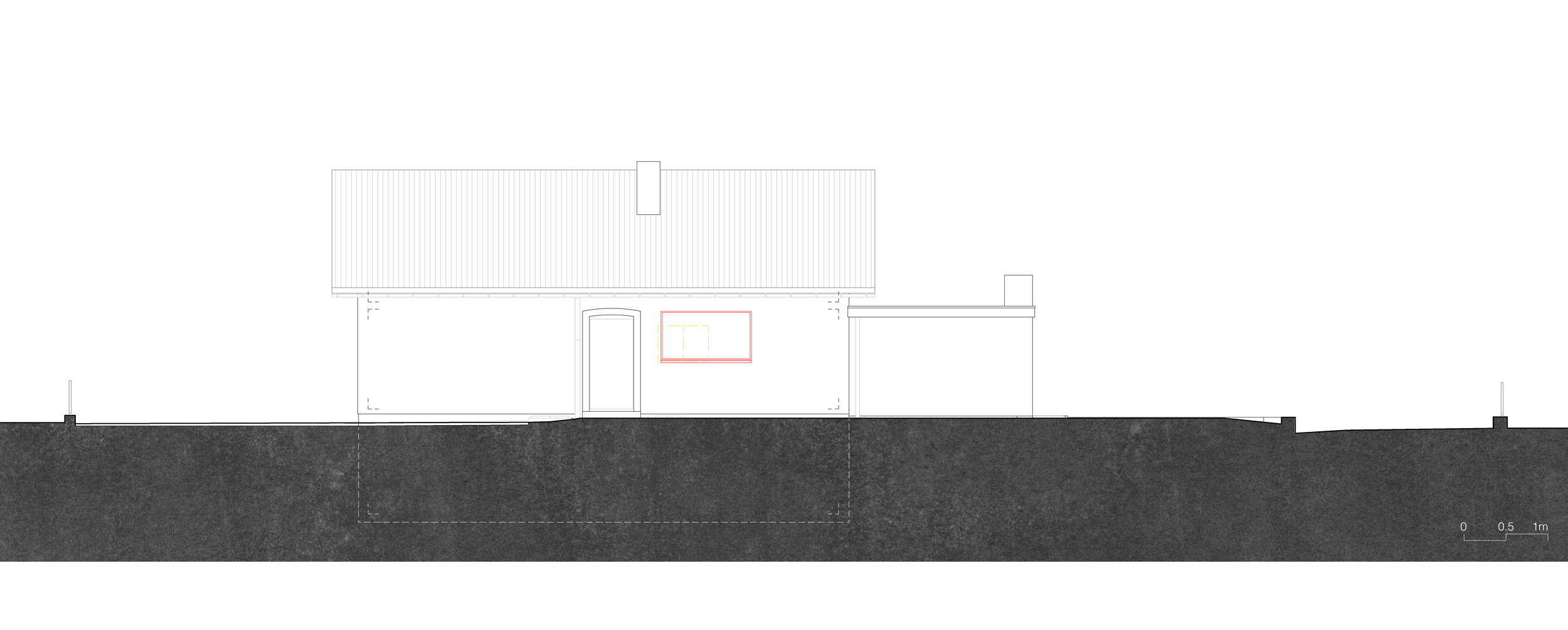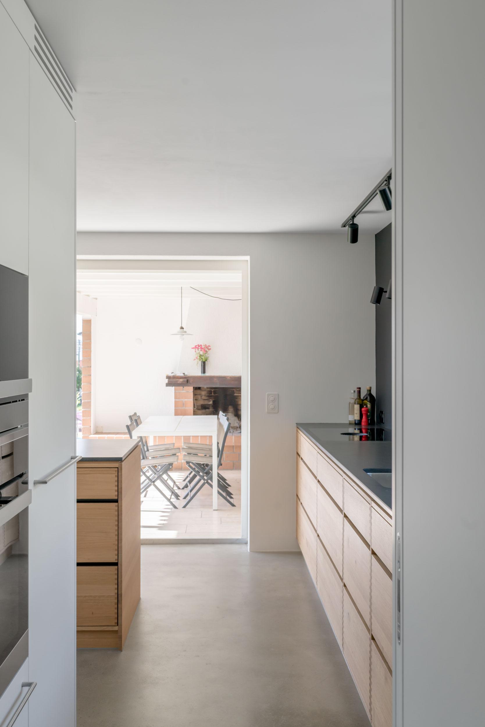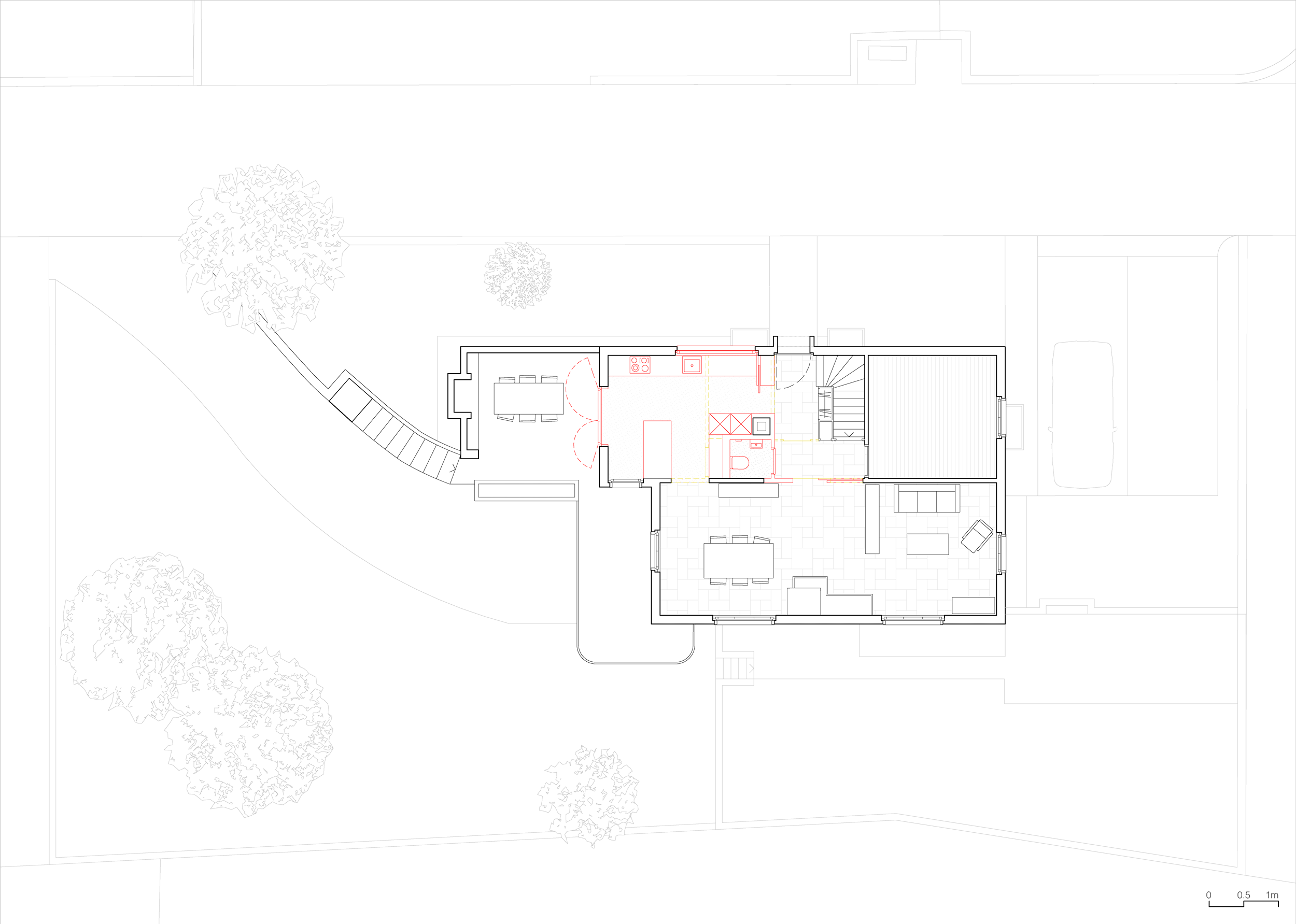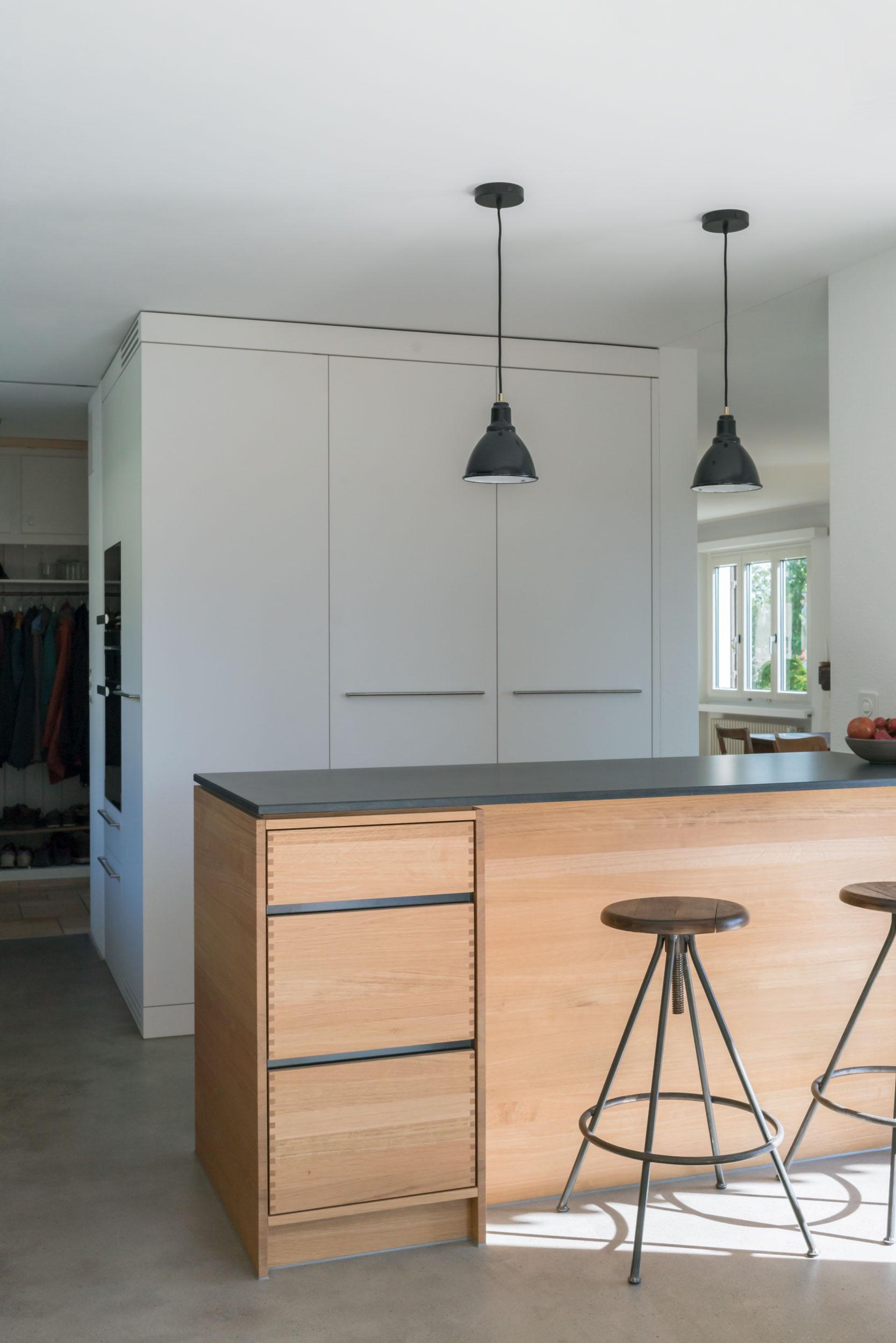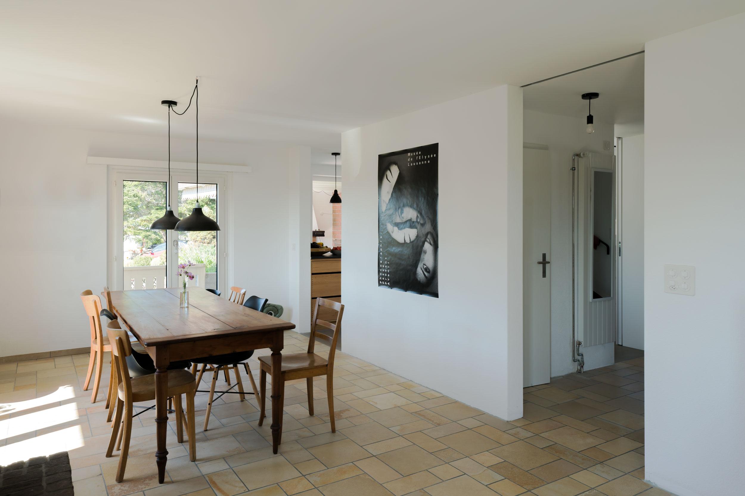 In dieser Phase wurde die beengte Grundrisssituation im Erdgeschoss umgestaltet. Das bestehende Badezimmer wurde durch ein kleines WC ersetzt. Die bisherige Gangerschliessung wurde durch ein Raum zu Raumkonzept mit Rundlauf umgebaut. Die enge Küche konnte so erheblich vergrössert werden und das Wohn/- Esszimmer ist neu direkt mit der Küche verbunden. Die direkte Verbindung bietet einen neuen spannenden diagonalen Blick durch das kleine Haus. Zwei weitere Öffnungen in der Fassade bringen Licht in das innere und verbinden das Haus nach draussen; das grosse Küchenfenster nach Norden mit ungekannten Blick in das ruhige Quartier sowie die breite zweiflüglige Türe zum gedeckten Aussenraum, die Verbindung der Küche nach aussen stärkt, insbesondere wenn im Sommer die zwei Flügel ganz umgeschlagen werden.